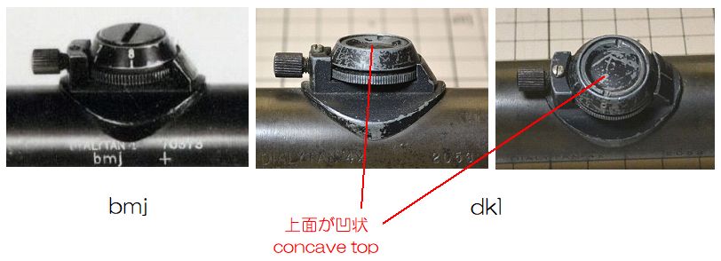 dkl製照準眼鏡を他社製照準眼鏡と比べて異色なものとしている。 メーカーコード「dkl」は、Josef Schneiderによって1913年にKreuznachで創業されたJosef Schneider & Co. Optische Werkeを 示している。このメーカーは、カメラ等の光学レンズの製造を専門としており、民間用の照準眼鏡の製造は戦前・戦後ともに行っていない。 戦争中のDIALYTANの生産は、戦時協力の一環として軍との契約に基づき、Hensoldt社(bmj)からレンズ以外の金属製部品の供給を受けて行われたものである。 このため、両者が同型であるのは当然であるが、外見上の唯一の違いがエレベーションタワー上面の形状にある。この相違点の理由は不明である。(図1参照) There is a DIALYTAN 4x scope manufactured by“dkl”, which is almost identical in design to the bmj DIALYTAN 4x. The similarity between these two has a reason, and it is this that makes the dkl scope distinctive compared to those made by other companies. Manufacturer code“dkl”denotes Josef Schneider & Co. Optische Werke, founded in Kreuznach in 1913 by Josef Schneider. This manufacturer specialises in the production of optical lenses for cameras and similar equipment, and has never manufactured civilian scopes, either before or after the war. The production of DIALYTAN during the war was carried out under military contract as a contribution to the war effort, with metal components other than lenses supplied by Hensoldt (bmj). Accordingly, it follows that both are identical in form, though the sole visible difference lies in the shape of the elevation tower's upper surface. Reasons for this difference are unclear. (See Fig. 1) |